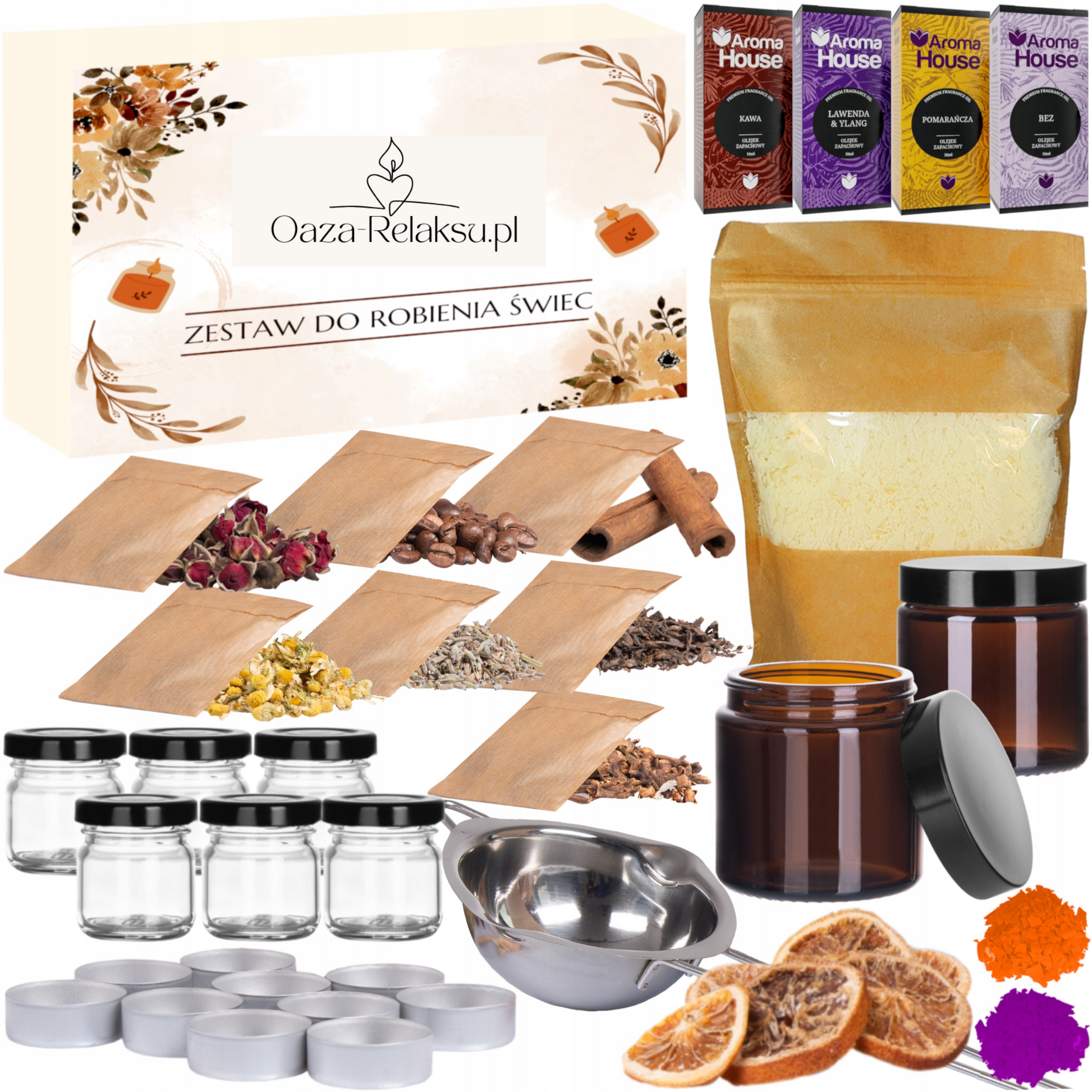 ZESTAW DO ZROBIENIA ŚWIEC SOJOWYCH XXL – Pomarańcza, Frezja, Drzewo Różane, Białe Kwiaty + 1Kg wosk Gratis!